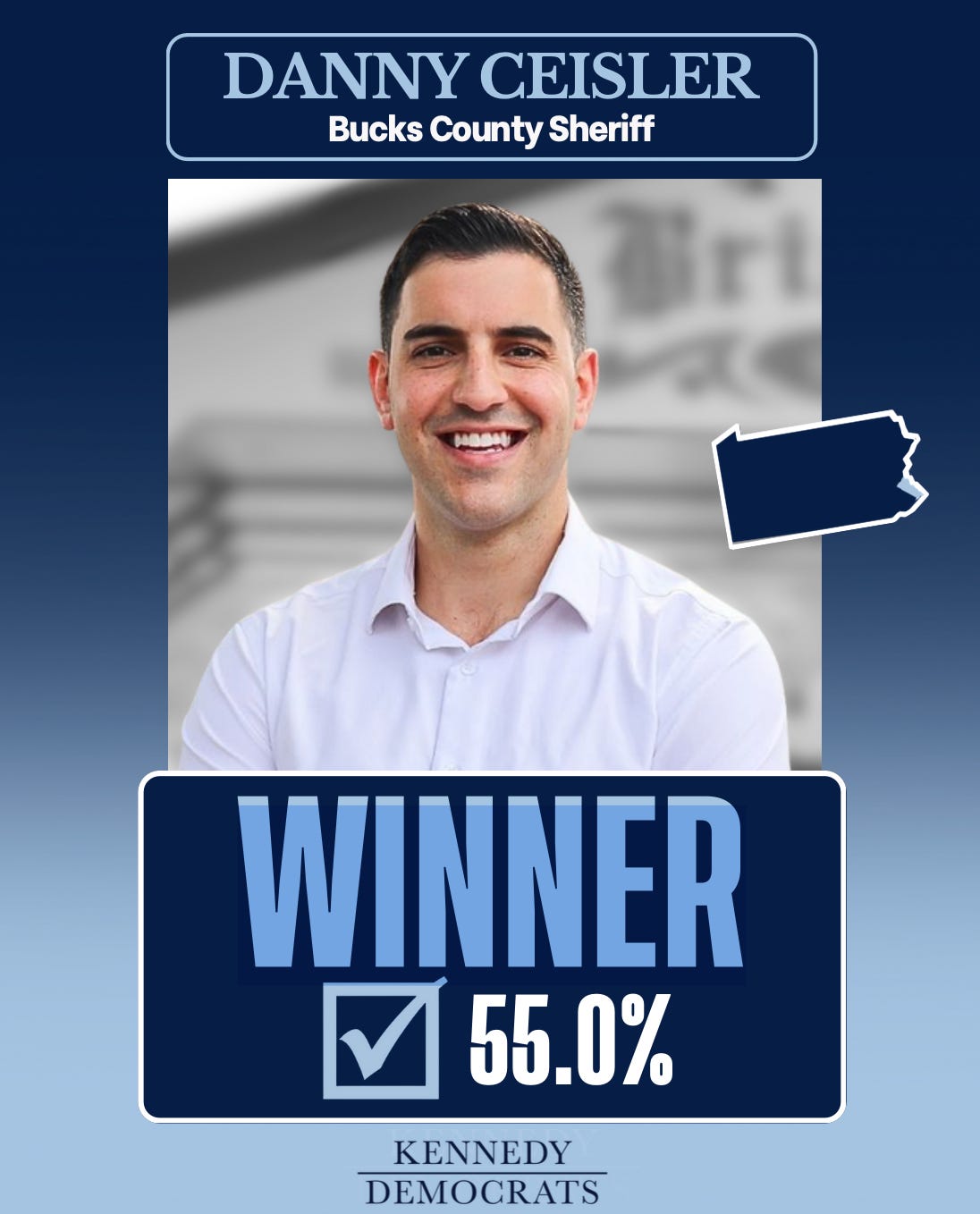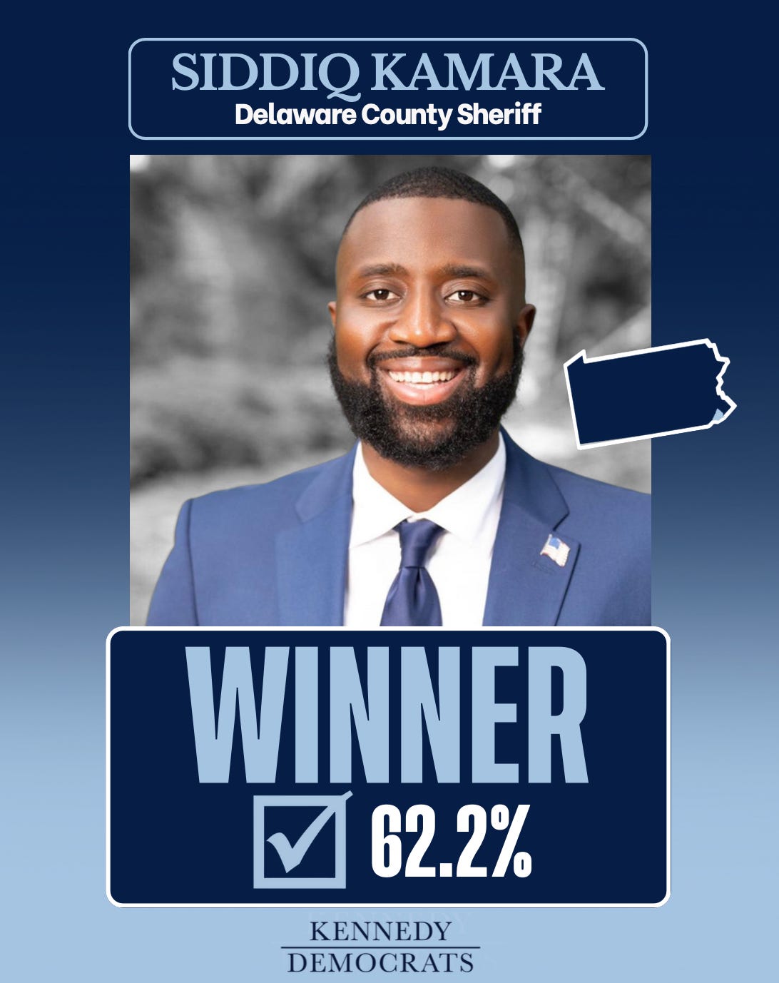 I couldn’t be prouder that Army veterans Danny Ceisler and Siddiq Kamara—two candidates endorsed by my PAC, Kennedy Dems PA—won their races for county sheriff in Bucks County and Delaware County, respectively. We also got a clean sweep for DA, row officers, and judges, including Tiffany Thomas-Smith, a military mom who made history as the first Black woman ever elected judge in Bucks County.