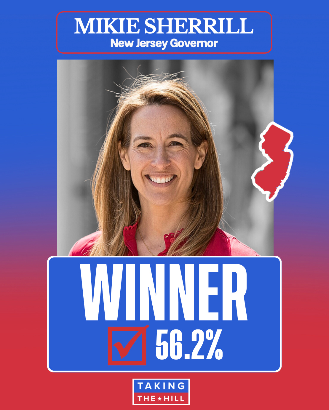 In New Jersey, Democratic Rep. Mikie Sherrill defeated Trump-backed Republican Jack Ciattarelli, becoming the state’s first woman Democratic governor. A former Navy helicopter pilot, Sherrill was first elected to the House as part of the 2018 blue wave midterms.